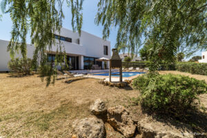 Surrounded by a flat garden with grass, native plants and a swimming pool with several areas to rest.