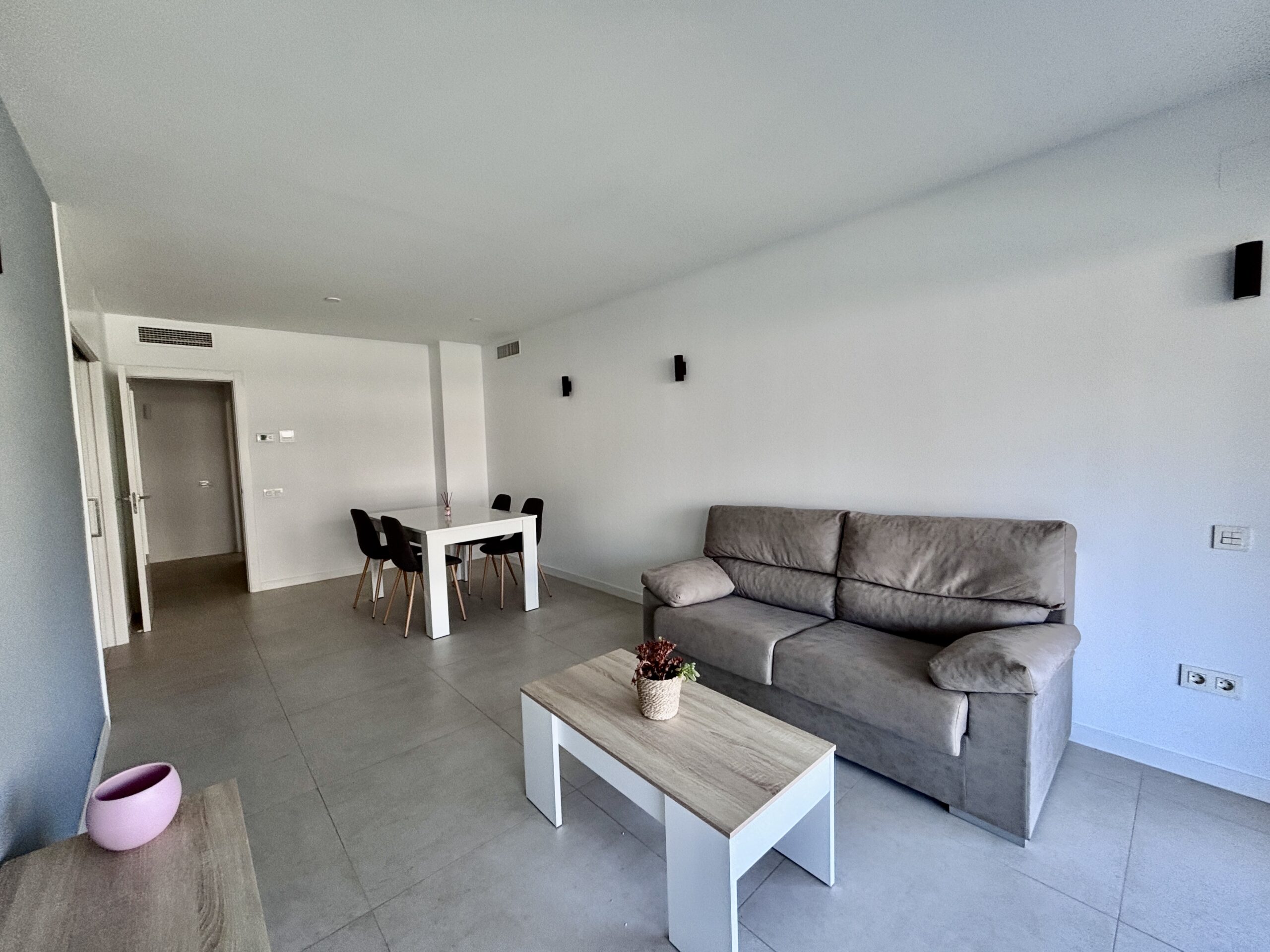 This modern apartment for sale is located in the exclusive Can Misses area, offering a perfect blend of comfort and contemporary living. The property features three spacious double bedrooms, all exterior-facing, and two full bathrooms including an en-suite master bathroom and a guest toilet. The bright, spacious living room is furnished and provides direct access to a charming terrace overlooking the large central saltwater swimming pool.