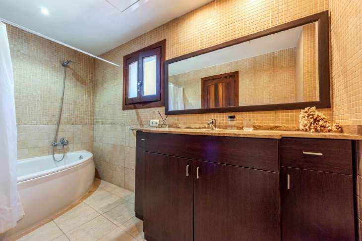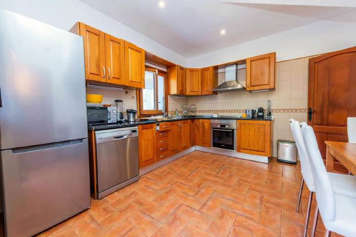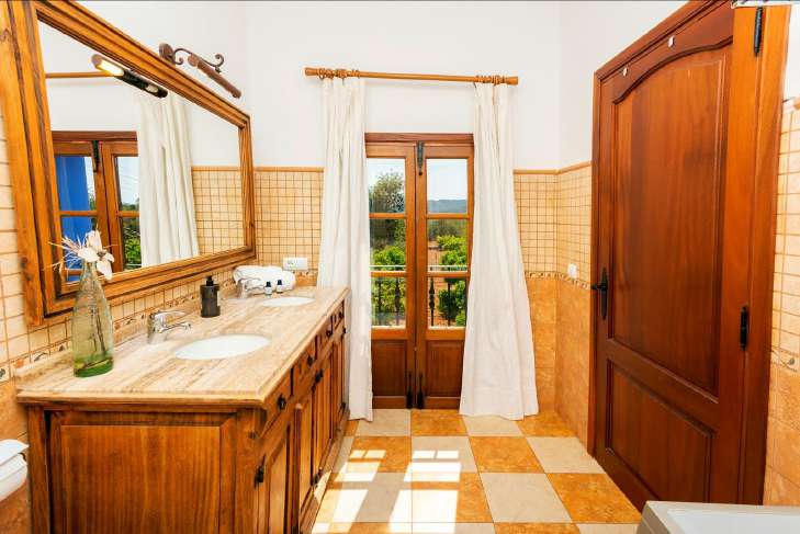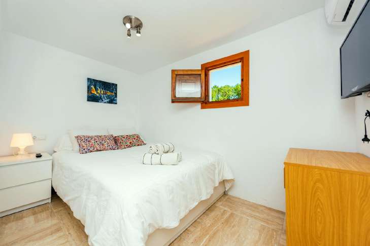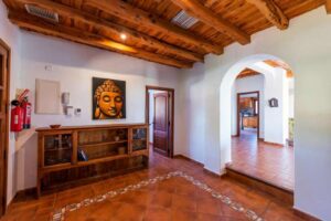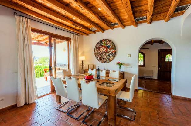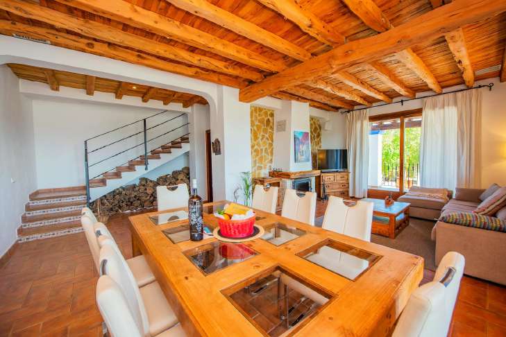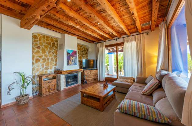 The villa preserves traditional Ibiza style with modern upgrades, featuring exposed beams and natural stone throughout its spacious layout.Interior Highlights: