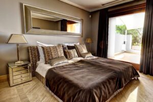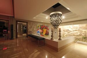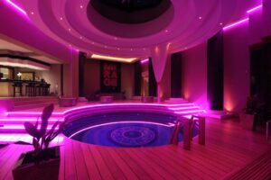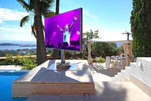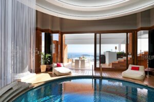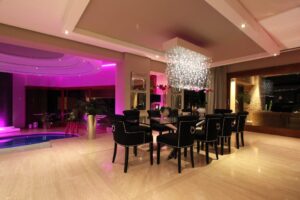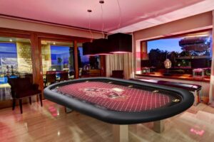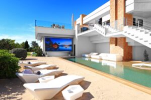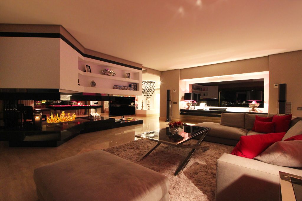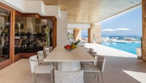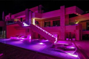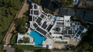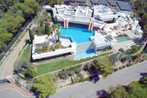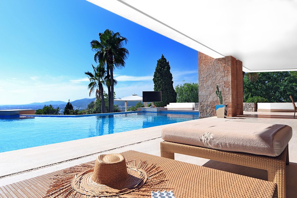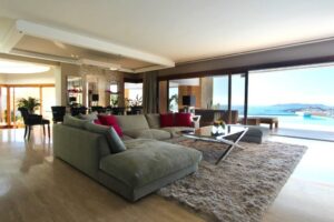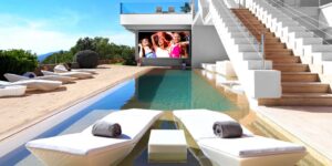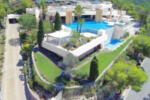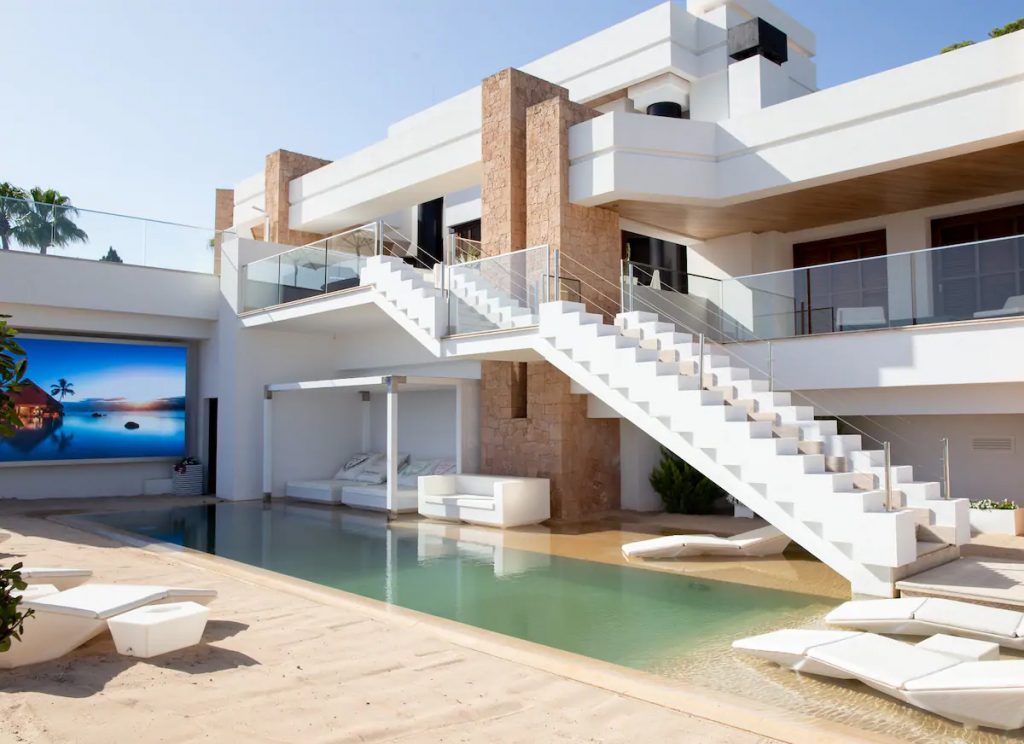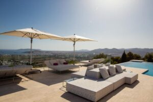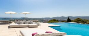 - Description: his very luxurious villa is located in the exclusive urbanization Can Rimbau on one of the highest points of the mountain with a sensational view of the sea, the castle of Ibiza, the country and Formentera. Can Rimbau is secured around the clock with video surveillance and accessible only to owners and their guests via a central entrance. Shops for the daily needs and a large selection of top restaurants are only 1 km away. The luxury villa Gaisens has 4 pools, an indoor pool, a beach pool, a children’s pool, a front pool and a jaccuzzi. From the heated outdoor pools and the Jaccuzzi you have a phenomenal 270° view of Ibiza city and the sea. The luxury house is south facing and has all day in the sun. In the morning you can see the sunrise in the east and the sunset in the west. At the beach pool there is an outdoor cinema of 15m2, which can also be enjoyed during the day due to the high resolution of the screen. At the front pool, Jaccuzzi and the dining table is another very large outdoor TV. All TVs in the house, the outdoor TV and the cinema offer all normal TV programs in all languages and all Internet programs. The sound system is Sonos controlled and has an exquisite sound both in the house and outdoors. The WiFi is very fast in all areas of the luxury property. The luxurious Villa MIRAGE-IBIZA has a very spacious, elegant living room which gives an incredibly spacious feeling. Show all description