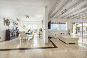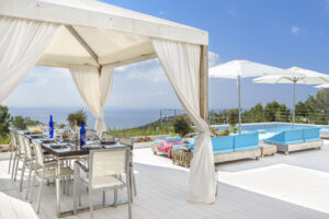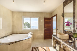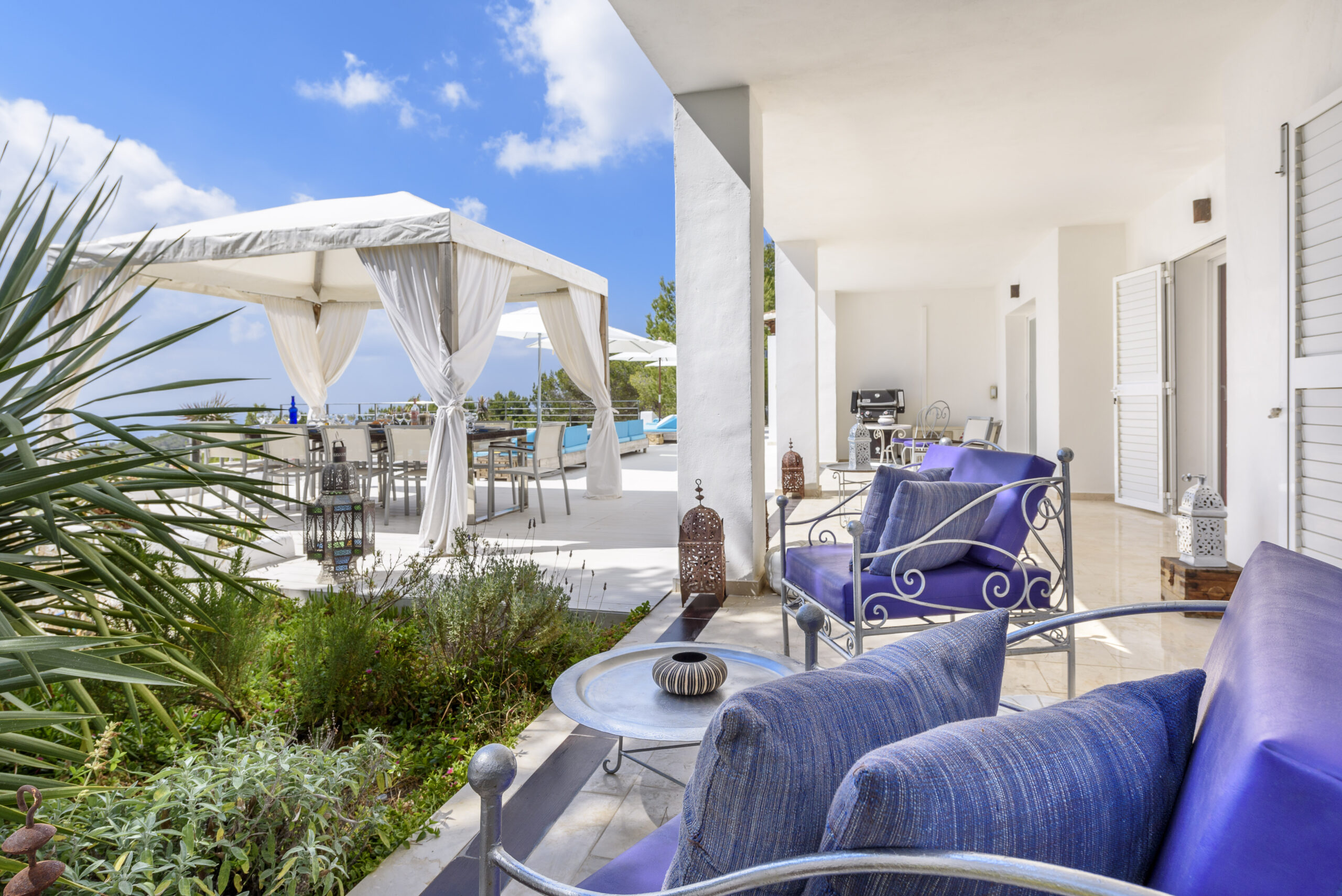 - Description: Modern- style villa located on one of the hill in Es Cubells with panoramic views to the sea, Formentera and the bay of Porroig and Cala Jundal. Stunning 6 bedrooms Ibiza 5* Villa : • Amazing house located in the hill of Es Cubells on the south of the island • Spectacular sea view over Porroig, cala Jondal and Formentera • All floors in the house are marble • 400 m2 built and 300 m2 of terraces built on 4500 m2 plot • 6 Bedrooms – 6 Bathrooms – 12 Persons • Southeast exposure, House redecorated with luxury modern decoration • Pool 9m x 5m and solarium of 170 m2 • Access to a sand beach at 10 min • All the rooms with terraces and sea view, air conditioning with TV satelite and DVD • Wifi and safe in the 3 main rooms • Located at 10 min from Cala Jondal, 20 min from center Ibiza and 15 min from Airport • Parking for 5 Cars Show all description